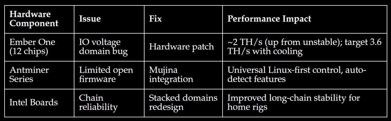 Hardware ComponentIssueFixPerformance ImpactEmber One (12 chips)IO voltage domain bugHardware patch~2 TH/s (up from unstable); target 3.6 TH/s with coolingAntminer SeriesLimited open firmwareMujina integrationUniversal Linux-first control, auto-detect featuresIntel BoardsChain reliabilityStacked domains redesignImproved long-chain stability for home rigs