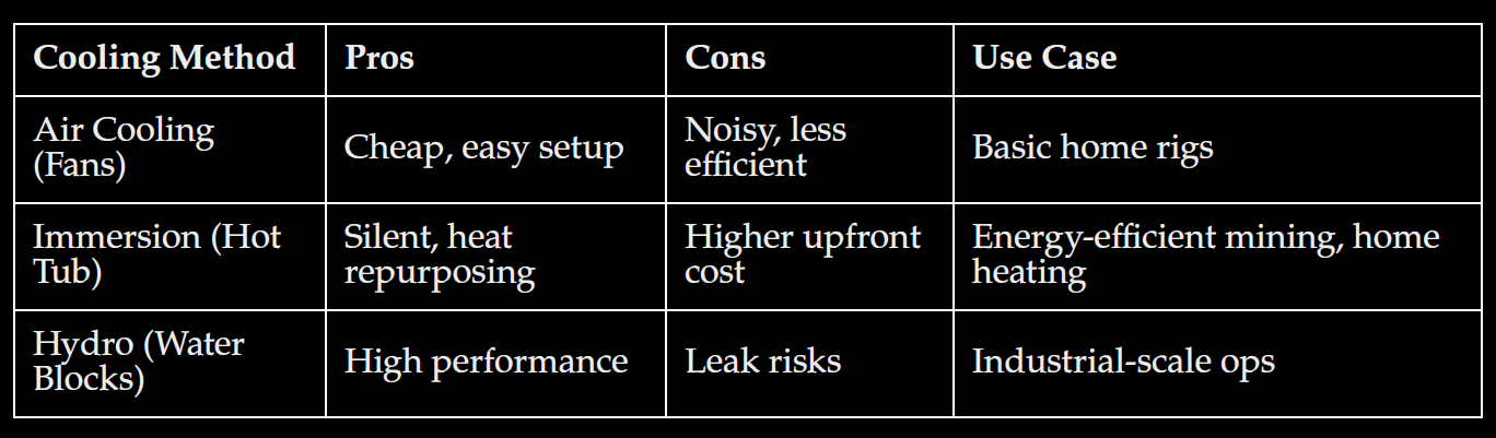 Cooling MethodProsConsUse CaseAir Cooling (Fans)Cheap, easy setupNoisy, less efficientBasic home rigsImmersion (Hot Tub)Silent, heat repurposingHigher upfront costEnergy-efficient mining, home heatingHydro (Water Blocks)High performanceLeak risksIndustrial-scale ops